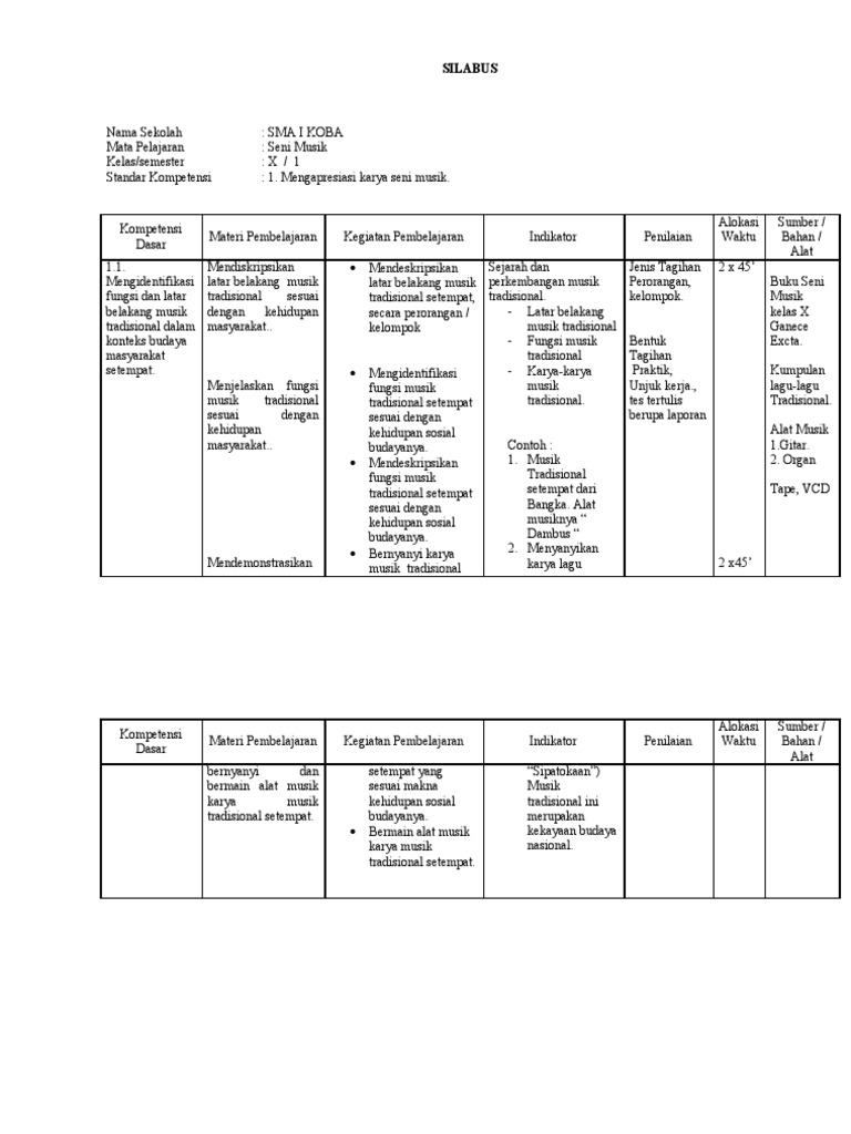 Silabus Seni Budaya Kelas X from imgv2-1-f.scribdassets.com Rpp 1 lembar bahasa inggris peminatan sma/smk k13 2020/2021 terbaru. Silabus fisika sma berkarakter kelas x semester 1 download. Mata pelajaran seni budaya memiliki sifat multilingual, multidimensional, dan multikultural. Silabus seni budaya semester 1. Pe pendidikan ja jasmani, ol olahraga da dan ke kesehatan : Berikut ini contoh bahan soal ulangan kenaikan kelas (ukk) pjok akhir semester 2 (uas) untuk tingkat sekolah dasar kelas 4 tahun ajaran 2. Silabus mapel seni budaya download. Seni budaya kelas 7 part 1 bab i menggambar flora, fauna, dan alam benda.